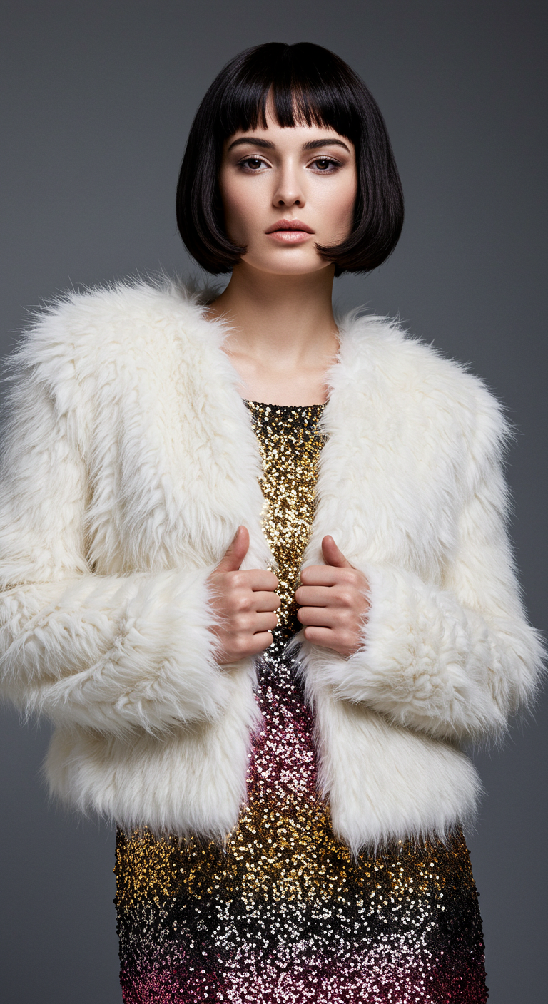 A bold and elegant look featuring a soft faux fur jacket paired with a sparkling ombre sequin dress. The combination of textures creates a glamorous and modern fashion statement